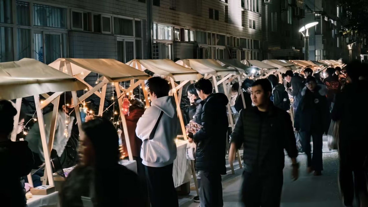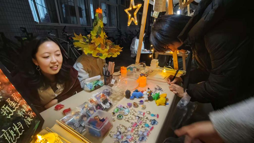 除了创意市集,夜市还设置了丰富的互动环节。在摊位消费的同学们能获得特色印章,并参与到套圈游戏中。“夜市不仅让我们在课余时间放松了身心,更提供了展示自我、交流互动的平台。”参与活动的同学如此表示。