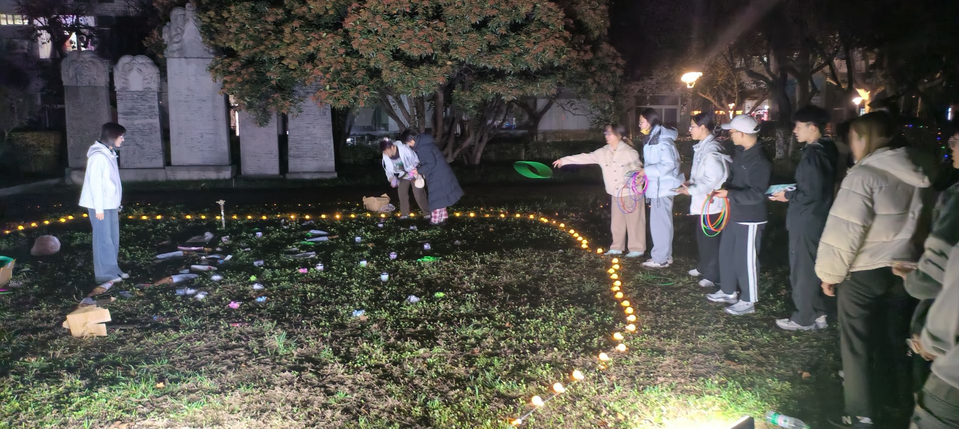 夜色渐深,璀璨的灯串与同学们的笑脸交相辉映,勾勒出一幅生动而温暖的校园夜景。整个活动现场人头攒动,秩序井然,充满了轻松、愉悦的交流氛围。